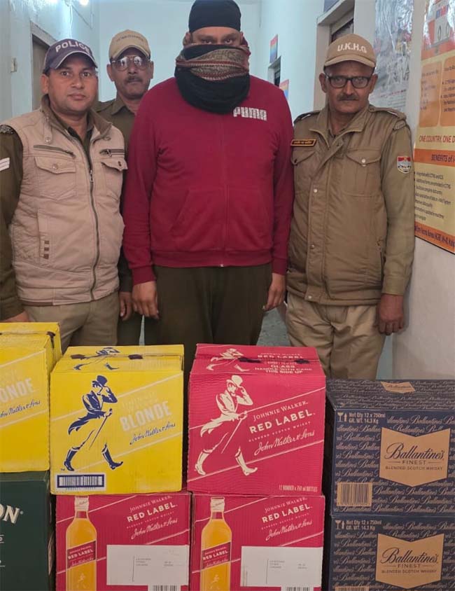 मौके पर ही पुलिस ने तस्कर सिमरन प्रीत (36 वर्ष), निवासी गोविंदपुरा सुभाषनगर, हल्द्वानी को गिरफ्तार कर लिया। पुलिस के अनुसार आरोपी एक बाइक मैकेनिक की दुकान चलाता है और हरियाणा से शराब की यह खेप हल्द्वानी लेकर आया था। बरामद माल में Red Label की 10 पेटियां, Jameson की 5 पेटियां, Ballantine’s की 5 पेटियां और Blonde की 5 पेटियां शामिल हैं।